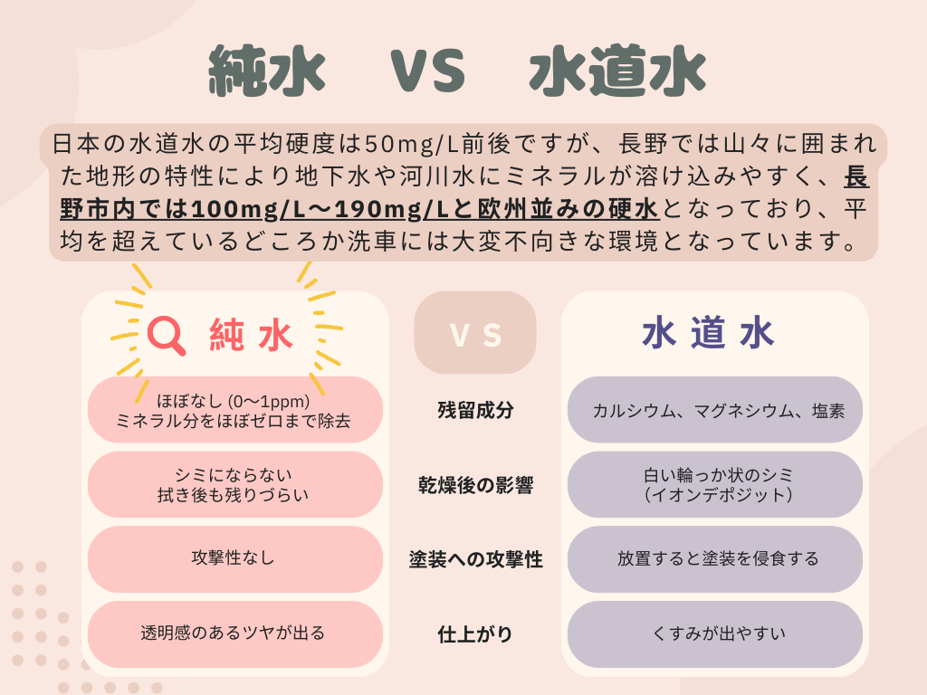 NOJ長野店ではほとんどすべての工程で【純水】を使って洗車していますので、「洗車後の白い跡や拭きスジが気になる…」という方には特におすすめです。